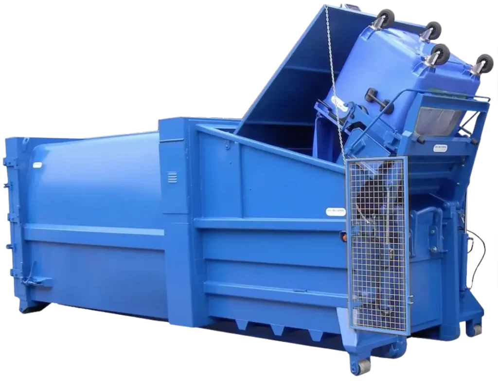Een containerpers comprimeert afval direct in een container, waardoor het volume aanzienlijk wordt verminderd.